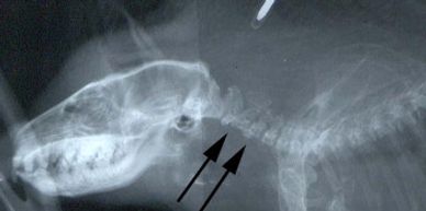 Progressive hindlimb ataxia, urinary stasis, loss of proprioception, and lameness, unable to ball up.